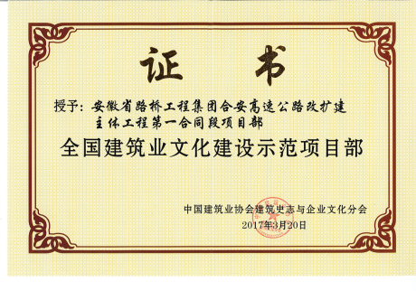 近日,由公司承建的合安高速改擴建主體工程第一合同段項目榮獲首批“全國建筑業文化建設示范項目部”稱號。該獎項是由中國建筑業協會、中建協建筑史志與企業文化分會共同評選頒發,首批共授予55個項目“全國建筑業文化建設示范項目部”稱號。