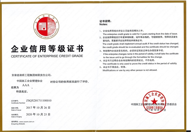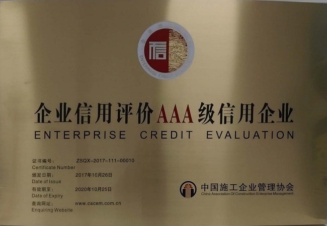 此次公司獲評中施企協企業信用評價AAA級信用企業,是外界對我公司管理能力、效益水平、發展前景等綜合實力的認可,為提高公司知名度和競爭力增添了新的砝碼。