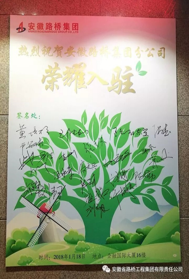 2018年1月18日上午8時38分,在一片喜慶熱鬧的氣氛中,安徽路橋集團分公司入駐儀式在企融國際16樓舉行。路橋集團領導班子部分成員、各分公司領導班子等參加儀式。