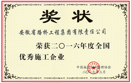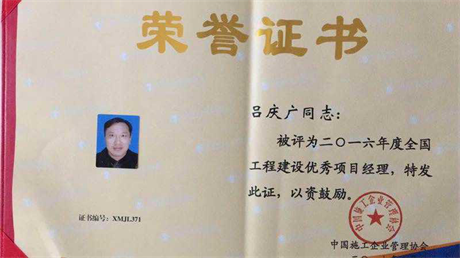 近日,中國施工企業管理協會在廈門召開會議,公布了2016年度“全國優秀施工企業”、“全國工程建設優秀項目經理” 評選結果,我公司榮獲2016年度“全國優秀施工企業”,項目經理呂慶廣榮獲“全國工程建設優秀項目經理”稱號。
