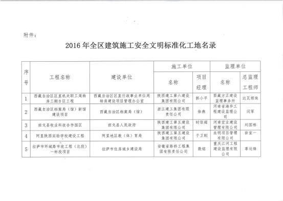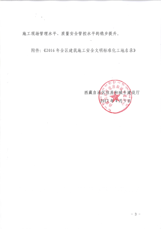 經過一系列有力措施,施工一年多來,該項目未發生一起安全事故。安全文明施工達到標準化和常態化,施工現場文明整潔,營造了安全和諧的施工氛圍,受到各方的肯定。經西藏自治區住房和城鄉建設廳資料審核、現場勘查、初評、綜評、終評等環節考評,最終從百家申報單位中脫穎而出,獲評西藏自治區“建設工程施工安全文明標準化工地”,為公司在西藏自治區營造了良好的社會形象。