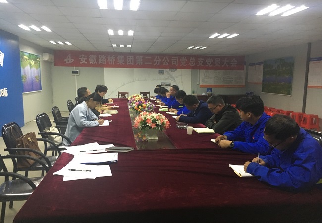 在公司順利完成頂層設計之際,第二分公司各項籌備工作有序開展,2017年11月9日晚,中共安徽省路橋工程集團有限責任公司第二分公司總支部委員會首次黨員大會在池州大橋接線08標項目部召開。公司黨委委員、副總經理錢葉琳、公司黨委工作與人力資源部副主任徐慧玲、公司紀檢監察室監察員宋暢同志應邀出席會議,會議由第二分公司黨總支籌備負責人蔡昊同志主持。