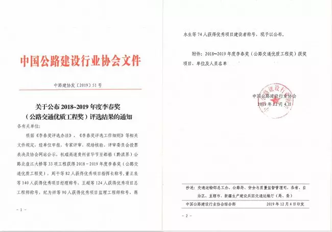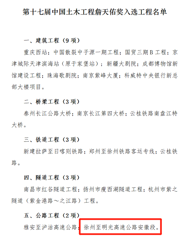 近年來,安徽路橋集團秉承工匠精神,打造精品工程。8月,公司承建的徐州至明光高速公路項目喜獲中國土木工程學會“詹天佑獎”公示。中國土木工程詹天佑獎由中國土木工程學會和北京詹天佑土木工程科學技術發展基金會于1999年聯合設立,是經國家批準、建設部認定、科技部首批核準的科技獎勵項目,已經成為我國土木工程建設領域科技創新的最高獎項。12月,由公司承建的岳西至武漢高速公路安徽段路基09標、路面02標,黃山至祁門高速公路路基05段項目雙雙榮獲公路建設最高質量獎——“李春獎”。