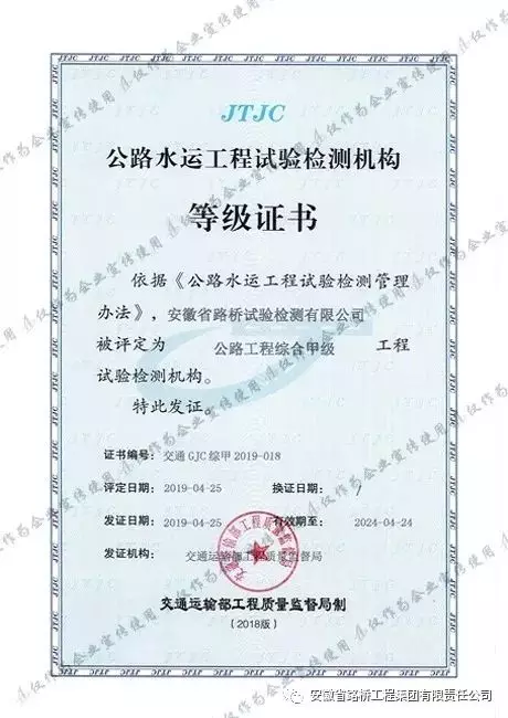 4月25日,經國家交通運輸部工程質量監督局審查核發,公司全資子公司安徽省路橋試驗檢測有限公司正式獲批公路工程綜合甲級資質,成為新資質標準出臺后安徽省首家獲批公路綜合甲級檢測資質的企業,安徽省第四家擁有公路綜合甲級檢測資質的企業,并順利開展首個市場化交竣工驗收項目。今年,公司又新增建筑施工總承包三級資質,企業資質進一步豐富。