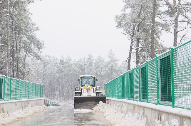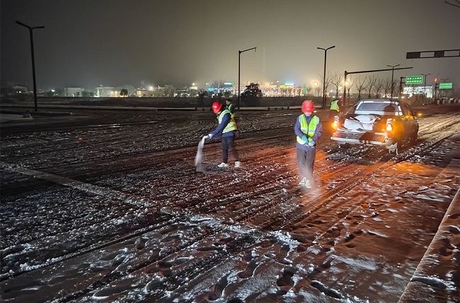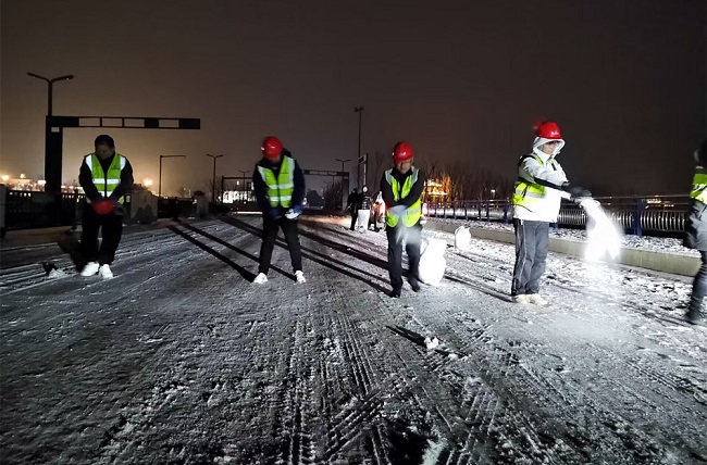 面對寒潮降雪天氣,項目部“以雪為令”,迅速啟動惡劣天氣應急預案,全面開展除積雪工作,全力為群眾出行安全、道路暢通保駕護航。通過科學分工,明確任務,管理人員對施工現場、生活區、辦公區等進行了全方位檢查,尤其是對施工區的鋼筋大棚以及各平交路口等重點部位進行了詳細的安全排查。項目員工在施工道路改三橋(K8天橋、金梅路跨206天橋、K12天橋)進行了撒鹽解凍和積雪鏟除等工作,在重點路段加強巡邏管控,引導車輛減速慢行,確保道路總體通暢。