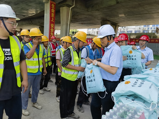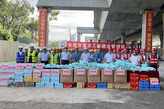 張剛一行詳細了解施工進展情況及項目部防暑降溫舉措,看望并慰問高溫下仍堅守崗位的一線工人,同工人們進行親切交流,送上了人丹、十滴水、洗漱用品及礦泉水等防暑降溫物資,感謝他們為合肥大建設作出的貢獻,并叮囑工人們要注意自我防護和安全生產,做好防暑降溫,做到勞逸結合,適當休息,以健康、飽滿的狀態投入到生產中。