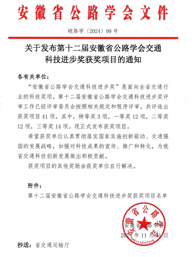 “安徽省公路學會交通科技進步獎”是面向全省交通行業的科技獎項。第十二屆交通科技進步獎評審工作經評審委員會按照相關規定和程序評審,共評選出獲獎項目41項。