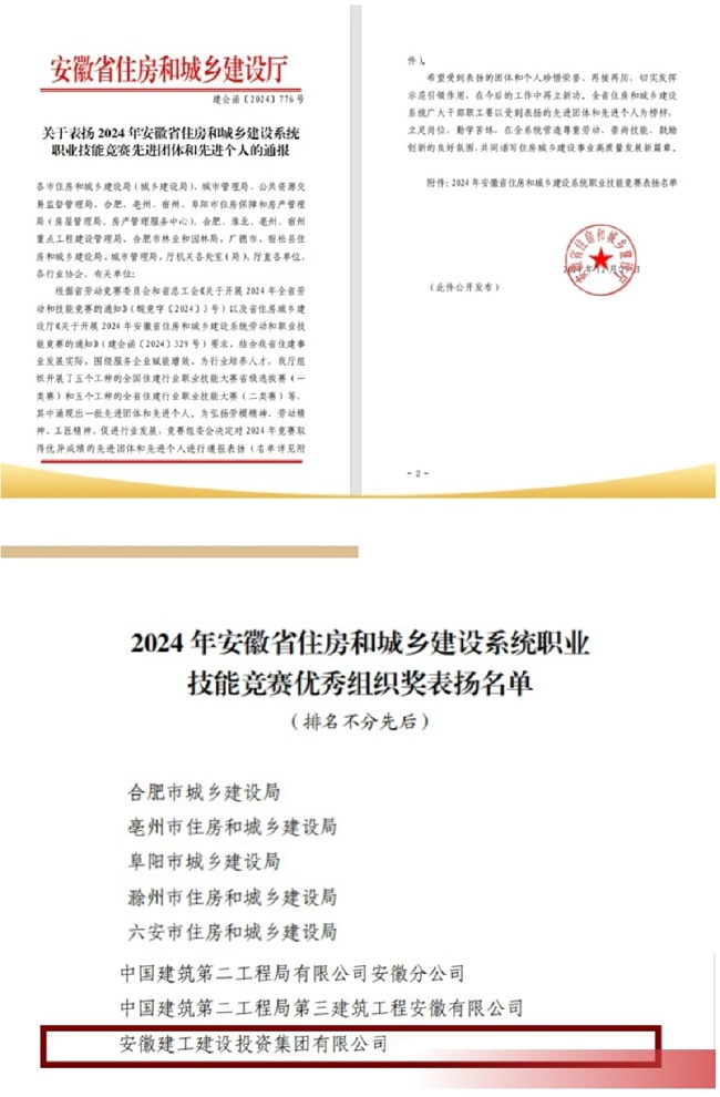 近日,安徽省住房和城鄉建設廳發布《關于表揚2024年安徽省住房和城鄉建設系統職業技能競賽先進團體和先進個人的通報》,對2024年競賽取得優異成績的先進團體和先進個人進行通報表揚。其中,建工建投集團喜獲優秀組織獎!另4名員工喜獲先進個人表揚。