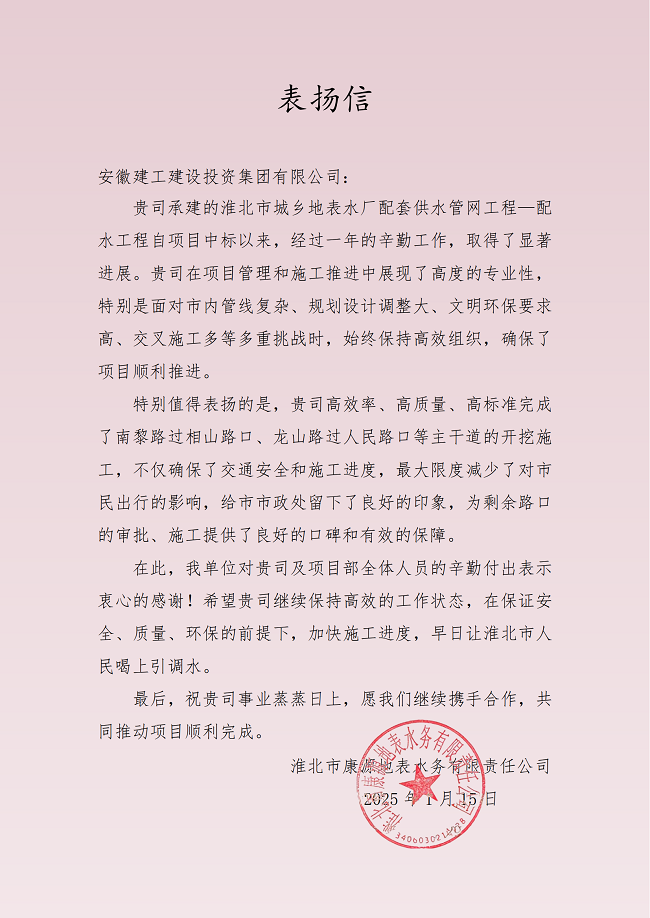 近日,建工建投集團淮北供水管網項目部收到業主單位淮北市康源地表水務有限責任公司發來的表揚信,信中對項目部全體成員的辛勤付出和專業管理能力給予高度評價,并對項目在關鍵節點的高效推進表示由衷感謝。
