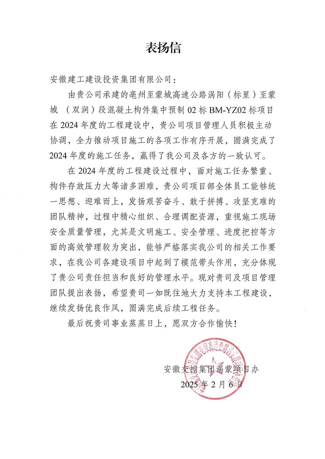 近日,安徽交控集團渦蒙項目辦發來《關于表彰渦蒙高速公路2024年度先進單位、先進集體、先進個人的決定》,亳蒙預制02標項目榮獲“渦蒙高速公路2024年度先進單位”稱號,項目合同部榮獲“先進集體”稱號,唐佩和韓磊兩位同志榮獲“先進個人”稱號,同時,項目喜獲業主來信表揚。