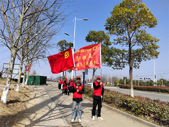 二軍路項目青年志愿者們積極對廬江縣城主干道路兩邊綠化帶進行垃圾清理,同時對施工現場封路路段的往來車輛進行交通疏導,方便居民出行。