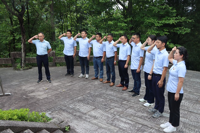 項目全體黨員、入黨積極分子、項目先進職工代表抵達紅色之旅第一站-愛國主義教育基地許家朋烈士紀念碑園。沿著革命先烈的遺跡,在蒼松翠柏間緬懷革命先烈,感悟革命烈士英勇事跡和激蕩熾熱的愛國之情,隨后支部書記陳衛衛帶領全體黨員在鮮紅的黨旗下和莊重的紀念碑前,再次立下入黨時的錚錚誓言。