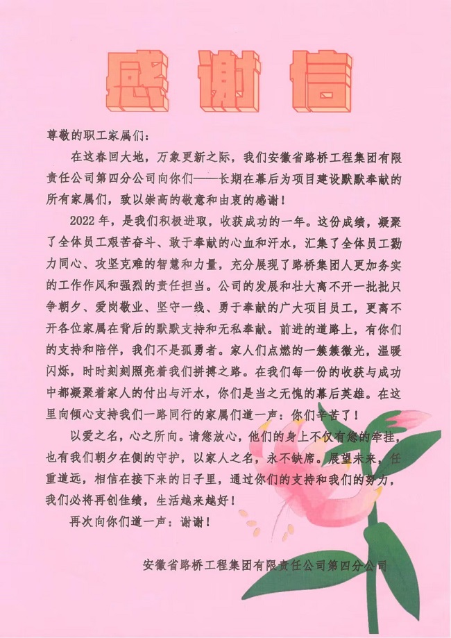 本次活動從策劃方案、選購慰問品、起草慰問信等,每一個小細節都滿載著四分公司黨政工團對員工及家屬的厚愛和感激之情。下階段,四分公司將持續聚焦項目職工所需所盼,把職工冷暖放在心里,以傳遞關懷、情暖后方的實際行動,解職工憂、暖職工心,全力做好項目職工的后方保障工作,讓項目職工切實感受到分公司的關懷和重視,踔厲奮發,勇毅前行,為助力公司高質量發展匯聚奮進力量。
