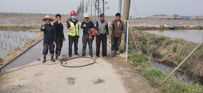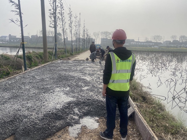 因村路損壞,與合廬產業新城項目部駐地一條馬路之隔的薛家圩村民出行飽受影響,項目部在處理地方協調事務時得知此情況,第一時間與薛家圩村干部積極溝通,奔赴現場查看情況并制定方案。隨后,工程部合理組織混凝土罐車、材料等,帶著村書記和村民們一同將薛家圩村損壞的道路進行修復,為百姓解決出行問題。