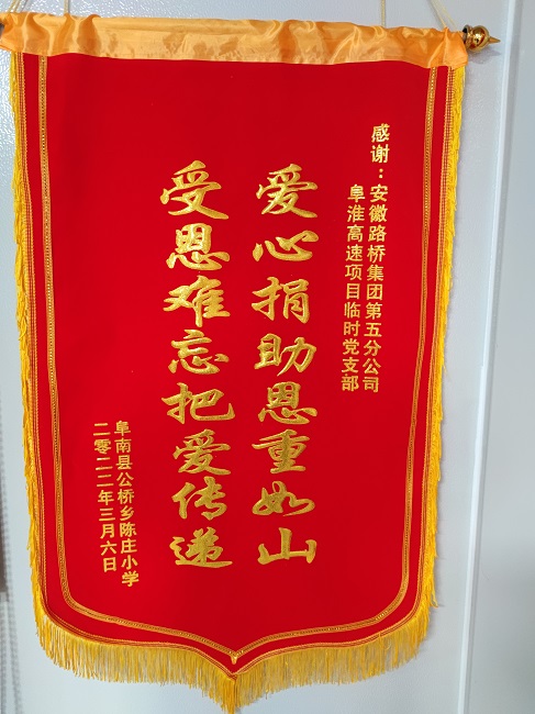 3月25日,阜南縣公橋鄉陳莊小學將一封感謝信和一面寫有“愛心捐贈恩重如山 受恩難忘把愛傳遞”的錦旗送至第五分公司阜淮高速項目臨時黨支部,以表達對項目部愛心助學行為的感激之情。