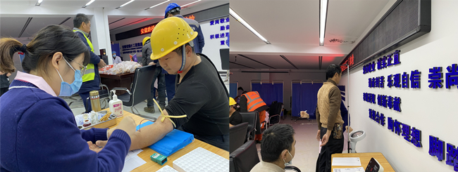 本次體檢由體檢中心醫生攜儀器在項目部駐地展開,檢查內容包含胸片、心電圖、肝功能、血常規等。體檢現場,秩序井然,醫務人員服務熱情,并結合作業人員的工作特點宣講安全生產知識。體檢結束后,專業醫師將體檢結果送到每位作業人員的手中,讓他們了解自身身體情況,并圍繞相關健康指標進行耐心答疑。項目部還為工人們準備了愛心早餐。