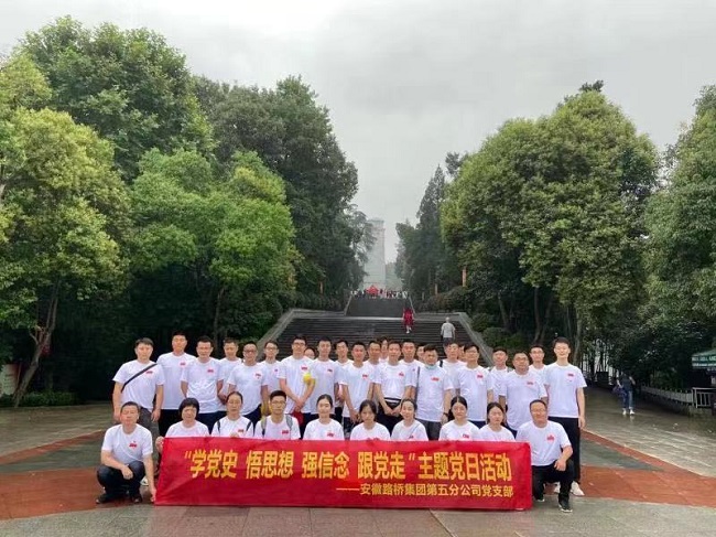 為紀念中國共產黨建黨100周年,全面深入落實好黨史學習教育,推進支部的組織建設,激勵全體黨員繼承和發揚黨的優良傳統和作風,進一步增強基層黨組織的凝聚力、號召力和戰斗力,安徽路橋集團第五分公司黨支部于6月26日到達有“紅軍的搖籃、將軍的故鄉”之稱的金寨縣,以“學黨史 悟思想 強信念 跟黨走”為主題,瞻仰革命先烈,重溫入黨誓詞,接受革命傳統教育。五分公司全體黨員、積極分子等40余人參加此次活動。