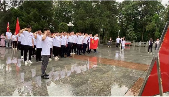 參觀展覽結束后,全體同志沿循環步道祭奠參觀了紅軍烈士墓園。園內安葬革命烈士和已故老紅軍近200位,同志們身臨其境地感受到金寨紅軍烈士忠貞不屈、甘于奉獻的高貴品格和革命精神。在洪學智將軍紀念碑前,同志們分批進行了默哀與致敬鞠躬。青松翠柏旁,莊嚴肅穆地回顧了兩膺上將的共和國領導人的光輝一生,感慨良多。兩名黨員代表向革命烈士敬獻花籃,分公司副書記、總經理代杰上前整理緞帶。隨后,全體同志面向烈士紀念碑三鞠躬,并莊嚴宣誓,重溫入黨誓詞,堅定入黨初心。