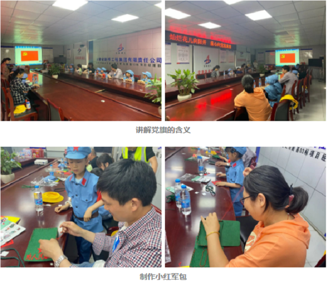 返回項目部后,全體活動人員在項目會議室共同參加“從小學黨史”親子黨史知識學習。項目黨員向孩子們生動講解了黨旗的含義及學習黨史的深刻意義,以“紅船精神”為起點向孩子們簡要講述中國共產黨的百年奮斗史。并給每位祖國的花朵發放《少年學黨史》書籍,讓每個孩子用雙手和心靈觸摸百年黨史,讓紅色的種子在孩子們的心中生根發芽。隨后的小紅軍挎包手工制作中環節中,孩子們在家長的指導下一針一線縫制象征著紅軍用的小挎包,并在小包上小心翼翼地粘上“為人民服務”的字樣。紅軍包完成后,孩子們都迫不及待地背起自己的“小紅軍包”讓家長拍照留念,稚嫩的臉龐洋溢著開心燦爛的笑容。最后大家一起觀看了兒童動漫黨史故事《紅軍長征的故事》。