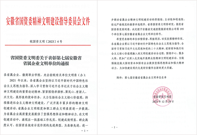 近日,省國資委文明委印發《關于表彰第七屆安徽省省屬企業文明單位的通報》,安徽建工建設投資集團有限公司被授予第七屆“安徽省省屬企業文明單位”稱號,這是公司連續2屆獲此殊榮,標志著公司精神文明創建工作再結新碩果。