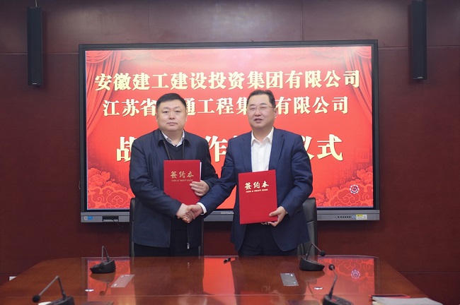 3月19日下午,安徽建工建設投資集團有限公司與江蘇省交通工程集團有限公司簽訂戰略合作協議。建工建投集團黨委書記、董事長任杰,江蘇省交通工程集團黨委書記、董事長、總裁王紀源出席簽約儀式,并進行座談交流。