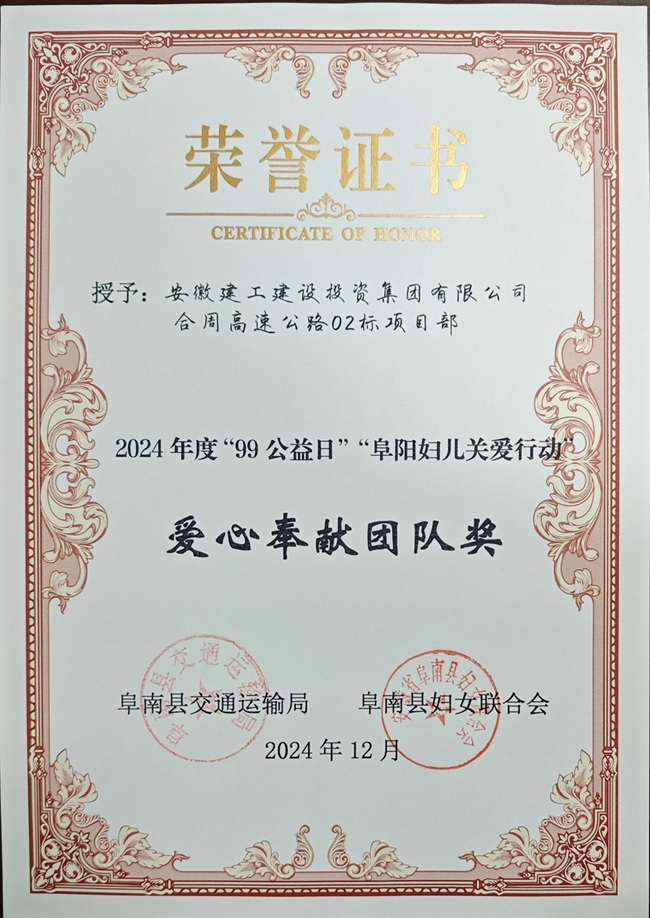 近日,安徽建工建投集團合周高速潁臨段YL-LJ02標項目喜獲雙表揚,收到阜南縣高速公路建設指揮部來信表揚,并獲阜南縣交通運輸局、阜南縣婦女聯合會聯合頒發的2024年度“99公益日”“阜陽婦兒關愛行動”“愛心奉獻團隊獎”。