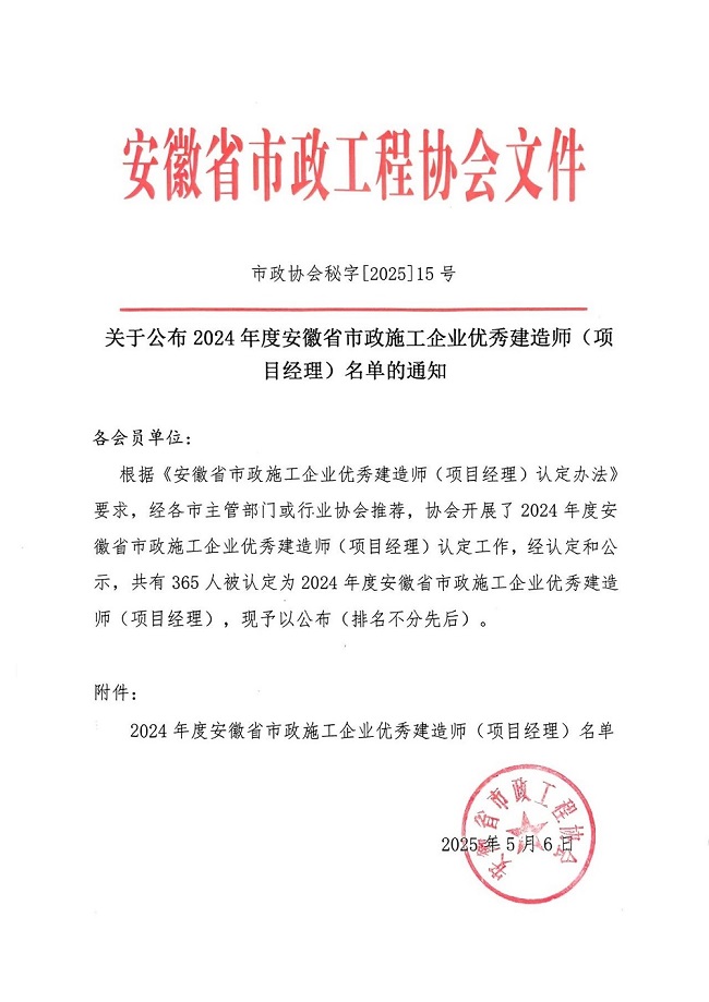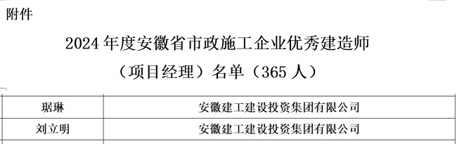 近日,安徽省市政工程協會發布《關于公布2024年度安徽省市政施工企業優秀建造師(項目經理)名單的通知》,建工建投集團兩名同志琚琳、劉立明喜獲殊榮。
