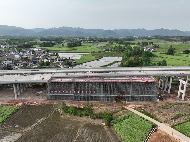涇青高速一分部包含現澆梁11聯,砼方量8343.6m3,梁寬10.0m-24.149m,梁高1.6-1.8m,均為變截面結構形式,梁下墩柱高6.8m-23.4m,均采用Z型盤扣式滿堂支架施工?,F澆梁結構形式復雜,安全風險高,施工難度大,是本項目的控制性關鍵工序。為確保現澆梁順利澆筑,項目部明確分工、精心組織、不斷優化打磨專項施工方案并通過專家評審,提前對澆筑工藝、安全、質量等進行全面交底。施工過程中,項目部主要人員現場督導,對支架搭設、模板安裝、鋼筋綁扎、混凝土澆筑、配合比、振搗、養護等各個環節嚴格把控,克服了基礎軟弱、高滿堂支架、涉鄉道門洞搭設等多項技術難題,規避了滿堂支架搭設、模板安裝、混凝土澆筑等過程中的安全風險,確保了現澆梁澆筑的圓滿順利完成。