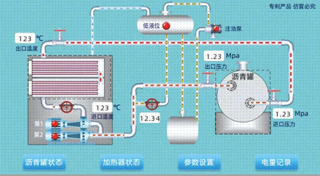 環保型電磁瀝青智能加熱設備由公司自主研發,革新傳統燃油加熱模式。瀝青電磁智能加熱系統通過電磁加熱元件對導熱油管路加熱,加熱后的導熱油再對儲存罐內的瀝青進行加熱,并通過智能化控制加熱溫度、加熱時間,實現了瀝青加熱的智能化作業和數字化管理。