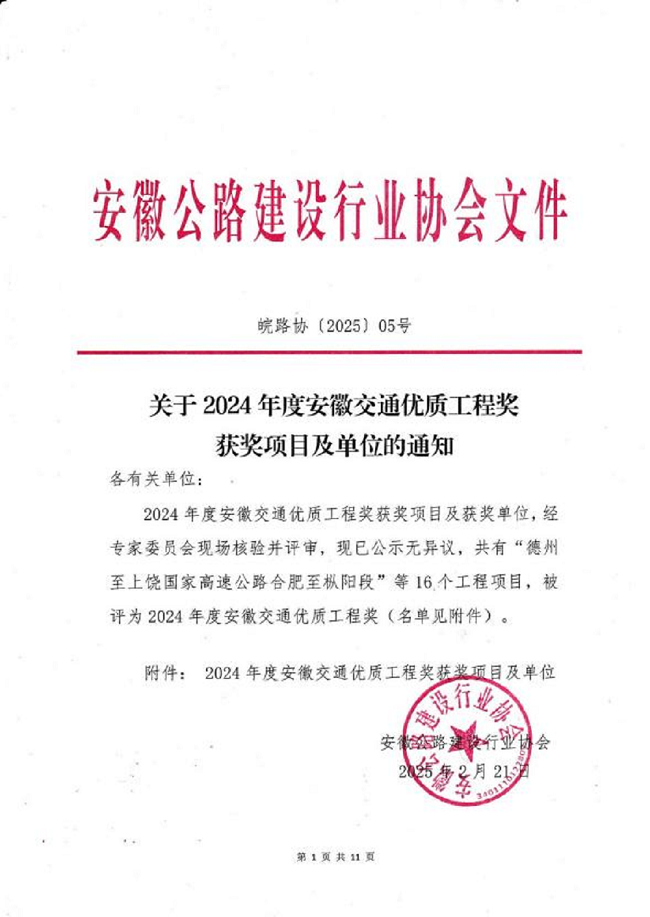近日,安徽公路建設行業協會發布通知文件,公布2024年度安徽交通優質工程獎評選結果及單位名單,共16個工程項目獲獎。
