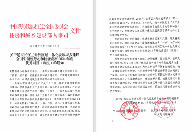 近日,中國海員建設工會印發《關于通報長江三角洲區域一體化發展城鄉建設全國引領性勞動和技能競賽2024年度優秀項目(班組)的通知》,安徽建工建設投資集團有限公司徐州至淮北至阜陽高速公路宿州段路基01標項目榮獲2024年度優秀項目榮譽稱號。