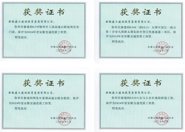 安徽交通優質工程獎由省交通運輸廳主辦,評選過程嚴格,旨在表彰在公路、水運等交通基礎設施建設領域內設計優秀、管理科學、技術先進、質量優良、運行安全且效益顯著的工程項目,是安徽省交通建設行業重要質量獎項之一。建工建投集團此次獲獎項目包括G3W德州至上饒高速公路池州至祁門段、S246(原S211)太湖至望江一級公路(合安九鐵路太湖東站至望江快速通道)項目、明光至巢湖高速公路合肥段、S325六安馬頭至長集段新建工程,充分展現了企業在交通建設領域的技術實力和質量管理水平。