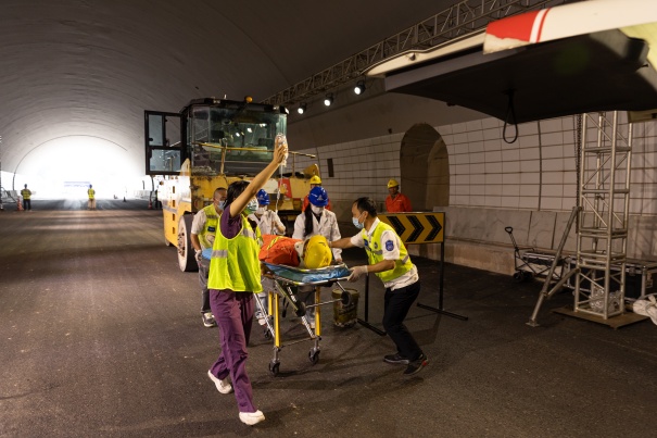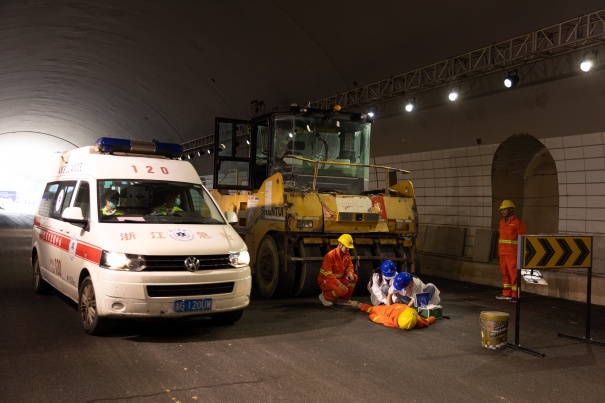 本次演練模擬牛山尖隧道在瀝青鋪設時,壓路機倒車撞倒作業人員并致其右腿受傷的場景。演練過程中,項目部迅速啟動應急預案,各應急救援小組在指揮長統一調度下迅速行動,安全保衛組設置警戒線,疏散無關人員;應急救援組專業而謹慎地接近受傷工人,并迅速采取緊急防護措施,以避免二次傷害;醫療救護組對傷者進行初步止血包扎,并撥打120急救電話。整個演練過程環環相扣、緊張有序,現場救援人員行動迅速、動作專業、訓練有素,圓滿完成了實戰演練任務。