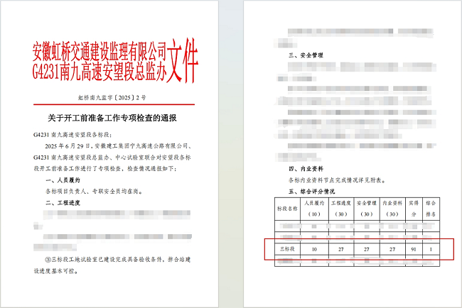 近日,安徽建工集團寧九高速公路有限公司聯合總監辦、中心試驗室,開展2025年6月各標段開工前準備工作專項檢查。經過人員履約、工程進度、安全管理、內業資料等多維度綜合考核,建工建投集團寧九高速項目在檢查中斬獲綜合排名第一的好成績!