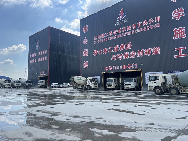 S20長固高速項目拌合站由1套180型和2套120型混凝土攪拌站組成,20臺罐車整齊列陣,高效配合作業。為保障高效安全生產,項目操作人員定期對攪拌站主機進行清缸與維保作業,備足易損易耗件,場站常駐維修人員,全力保障機械高效運轉。同時,項目積極開展有限空間作業安全交底培訓,采取“錯峰作業”模式,為員工配備防暑降溫物資,設置臨時休息區,確保作業安全。